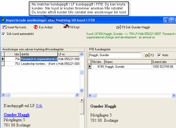 Ansökningar som importeras men inte kan knytas till kund automatiskt via lånekortsnumret (t ex beroende på att kunden inte alls är registrerad i FFB) visas i systemets "kundknytningsdialog" i vilken du manuellt får knyta post för post till rätt kund.