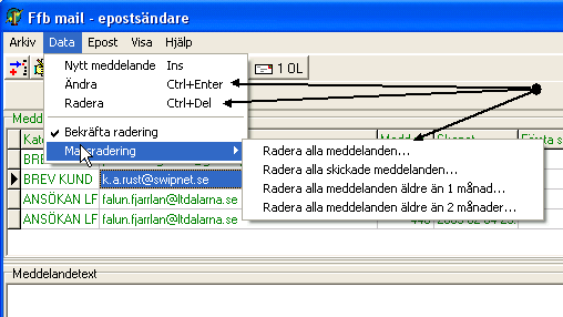 Skicka epost återgå När epostmeddelanden skapas i FFB (ansökningar, brev, krav, aviseringar etc) läggs dessa i FFB:s utkorg och där blir de kvar tills användaren aktiverar FFBMail och skickar iväg det som väntar. För att skicka epost, startar du alltså FFBMail från startmenyn. I FFBMails huvudfönster hittar du kommandoknappar och menyer som ger dig möjlighet att skicka allt som väntar eller enstaka meddelanden. Meddelandena kan skickas direkt till din organisations epostserver. Denna metod är snabbast men hos en del användare kan problem med brandvägg uppstå. För att komma förbi detta problem kan man använda den andra metoden som tillhandahålles, nämligen att meddelandena kopieras till epostklienten MS-Outlook. Det senare alternativet förutsätter att MS-Outlook 97 eller högre finns installerad på samma maskin som du kör FFB från (MS-Outlook måste finnas registrerad som Ole-server på den aktuella maskinen). Senare versioner av MS-Outlook har flera besvärande hinder när andra program anropar för sändning av epost. I korthet innebär dessa hinder att du måste bekräfta med klick på Ja/Nej dialog för varje meddelande som skickas. Det finns ett gratisprogram som gör denna procedur något mindre långsam och hindrande genom att klicka på Ja/Nej-dialogen åt dig så snart den dyker upp. Detta program kan du hämta på följande adress: http://www.express-soft.com/mailmate. En skillnad man bör också bör vara medveten om när man väljer om man skall skicka direkt till epostserver eller via MS-Outlook är avsändaradress. Om du skickar direkt till epostserver blir avsändaradressen den epostadress du ställt in i FFB:s allmänna inställningar. Om du skickar via MS-Outlook, blir avsändaradressen alltid den som är konfigurerad för den outlook-klient du skickar via.