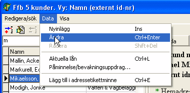 Sök fram den kund, vars uppgifter du vill ändra. Tryck därefter Ctrl+Enter eller välj från meny Data | Ändra...