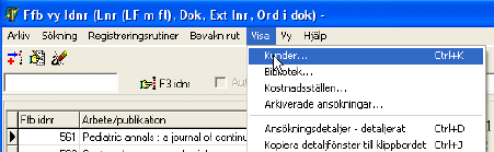 Om den sökta kunden saknas, får du nyinlägga kunden först och därefter välja den nyinlagda kunden. Nyinlägga kunduppgift återgå Du kan nyinlägga kunduppgift från huvudmodulen samt också från Ffbwebb. Oftast sker nyinläggning i samband med att kund som skall knytas till ansökan, inte finns. I huvudmodulen kan du också öppna kundregistret enbart för visning, vård och inspektion. Från huvudmodulens huvudfönster väljer du Visa | Kunder... eller också trycker du på tangent Ctrl+K.